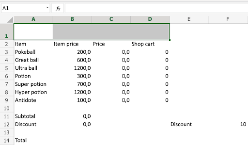 Type Poke Mart in the merged range A1:D1