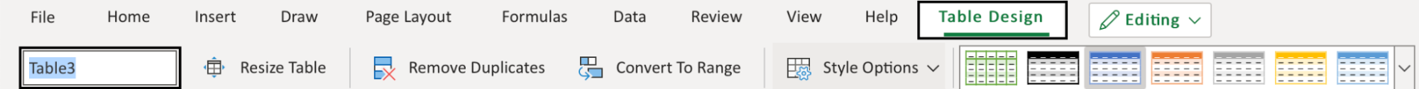 Converting a range into a table gives access to a menu called "Table Design".
