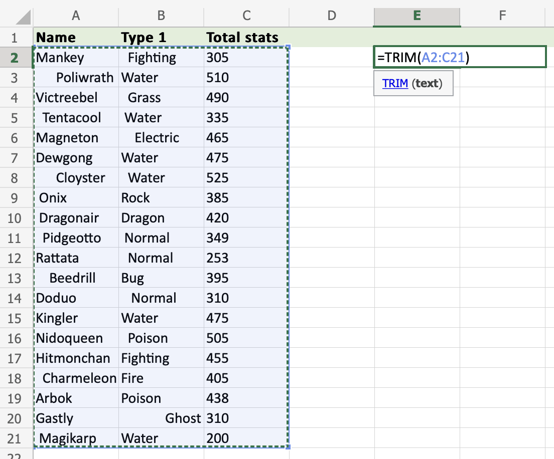 Use Trim to tidy up irregular spaces in the dataset within the range A2:C21.