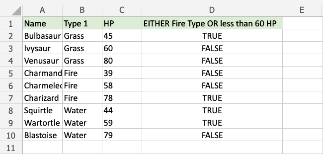 Now, each row has a check for Fire Type or HP less than 60, but not both: