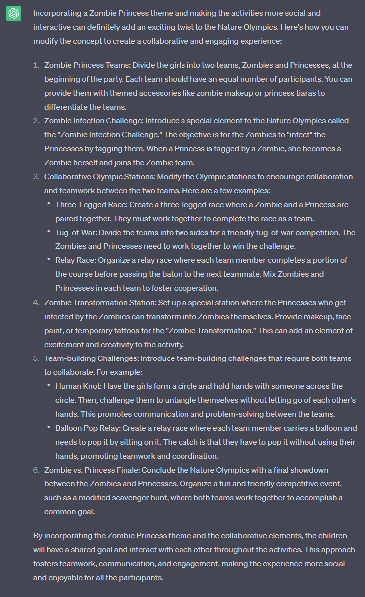 How can we make this more social for the girl? I am worried they will lose interest going off one by one, making it more difficult to organize. Let's add something to keep it fun. If we look at this with a Zombie Princess theme, how can we make it more of a thing they do together? Maybe starting as 2 teams, Zombies and Princesses. But the zombies can "infect" the princesses. How would that work within the Nature Olympics?