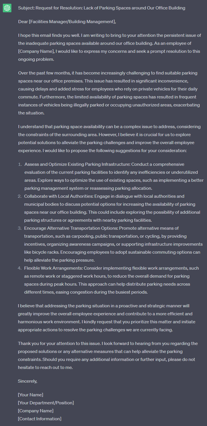 In this example, we want to complain about the lack of parking spaces around our office building.
