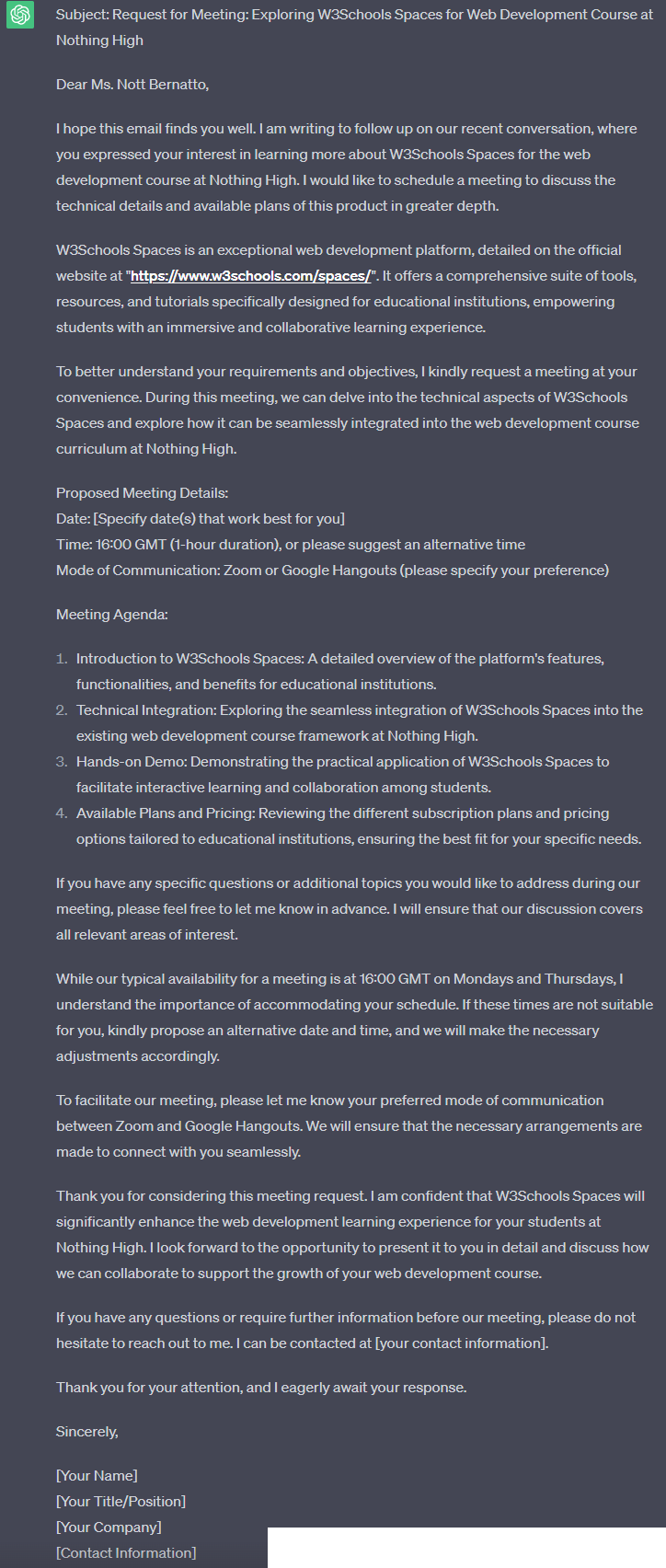 Write a professional email requesting a meeting for a discussion about using the product "W3Schools Spaces" (detailed here "https://www.w3schools.com/spaces/" ). The client has expressed interest and wants to know more about the product. The subject of the meeting is going through technical details and available plans. The client's name is "Nott Bernatto", and she is in charge of the web development course at "Nothing High", a high school in New York. We are typically available for an hour at 16:00 GMT on Mondays and Thursdays via Zoom or Google Hangouts but are flexible if that does not work for the client.