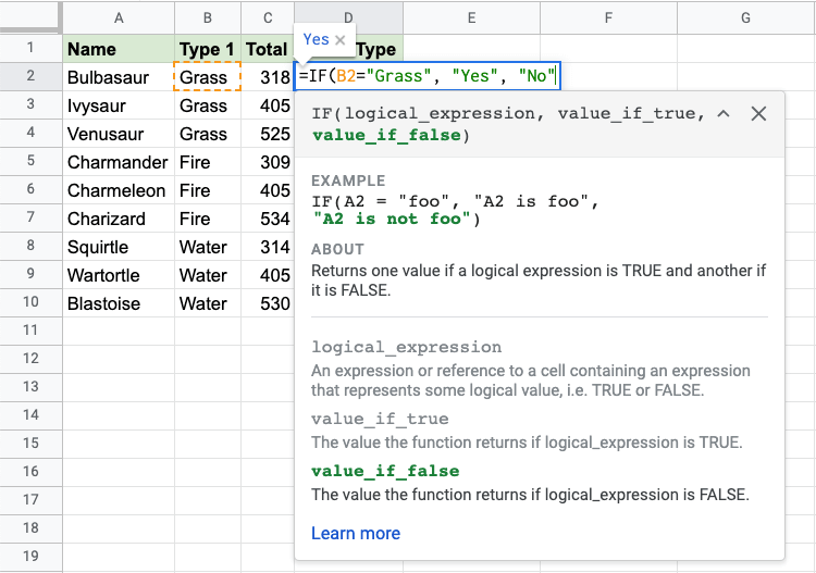 Since the value in cell B2 is "Grass", the condition is true and the function will return "Yes".