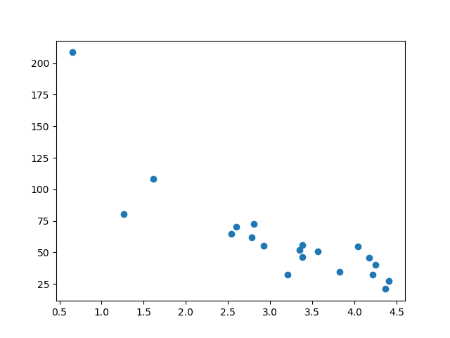 The result can back my suggestion of the data set fitting a polynomial regression, even though it would give us some weird results if we try to predict values outside of the data set. Example: the line indicates that a customer spending 6 minutes in the shop would make a purchase worth 200. That is probably a sign of overfitting.